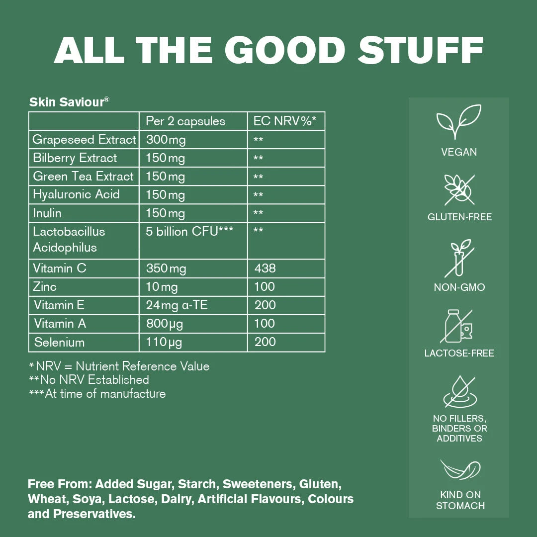 Skin Saviour® is an award-winning formula to fuel your body’s natural collagen production for a clearer, glowing skin complexion, healthier ageing, and combatting blemishes. High strength Hyaluronic acid, Vitamin C, prebiotics, live cultures, and powerful antioxidants.
